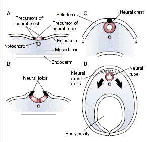 En los primeros días de desarrollo del embrión se forma una línea de células especializadas llamada notocorda, en donde actúan directamente las células del ectodermo para desarrollar el sistema nervioso primitivo (es decir, el neuroepitelio). Los bordes del neuroepitelio se doblan para formar el tubo neural; de su parte superior se desarrollara el encéfalo, del resto la médula espinal. Mientras tanto, el ectodermo y el endodermo continúan curvando alrededor y fundiéndose para crear la cavidad del cuerpo, terminando la transformación del embrión de un disco aplanado en un cuerpo tridimensional. Las células que se originan en los extremos cerrados del tubo neural emigran a diferentes partes del embrión para desarrollar estructuras corporales en varios sitios.